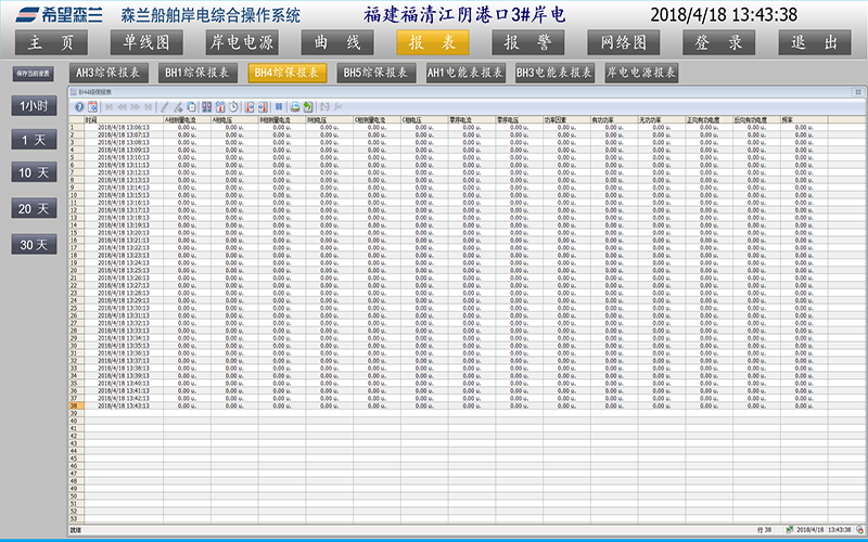 日?qǐng)?bào)表:按岸電電源要求的日?qǐng)?bào)表格式表示全天運(yùn)行的實(shí)時(shí)數(shù)據(jù)的統(tǒng)計(jì)值,并能查五年內(nèi)的報(bào)表。