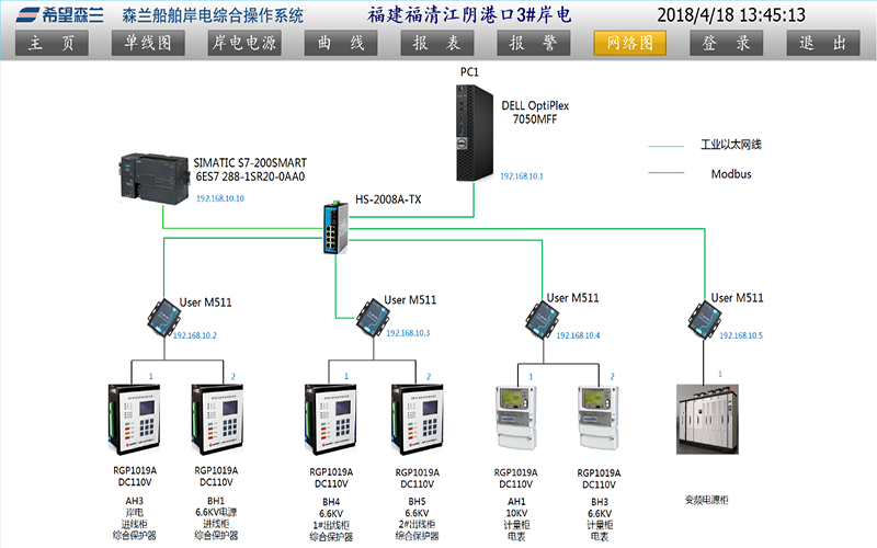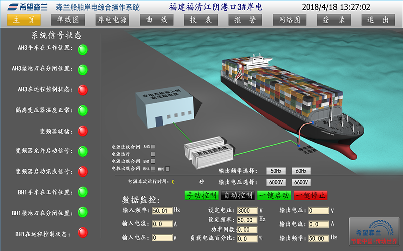 電氣主接線圖:以移屏和分幅顯示方式顯示岸電系統(tǒng)電氣主接線圖,并表示出運(yùn)行狀態(tài)。測(cè)量參數(shù):P、Q、COSφ、V、A、F。以移屏和分幅顯示方式顯示岸電電源的直流系統(tǒng)、站用電接線圖。運(yùn)行人員或工程師以在線鍵盤輸入的交互方式可編輯各設(shè)備的運(yùn)行、測(cè)試、接地、鎖定等工況報(bào)告,對(duì)這些報(bào)告可以進(jìn)行修改、檢索、顯示、打印。