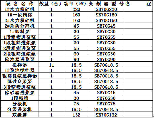 造紙生產(chǎn)線上的輔機很多,為節(jié)能基本都需要變頻調(diào)速。實踐已經(jīng)證明,造紙輔機實施變頻調(diào)速后,平均節(jié)能在12%,經(jīng)濟效益明顯。浙江富陽某造紙廠生產(chǎn)線上的部分輔機設(shè)備如下表: