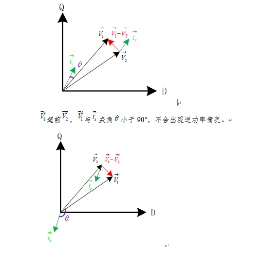 兩個(gè)電壓源同時(shí)給負(fù)載供電時(shí),由于并網(wǎng)運(yùn)行時(shí)的相位、頻率和幅值之差導(dǎo)致的逆功率。下面從矢量圖分析幾種逆功率產(chǎn)生的機(jī)理,V1為岸用電源,V2為發(fā)電機(jī)電源。