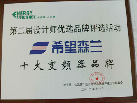 2012年11月30日,在北京舉行的第二屆設(shè)計(jì)師優(yōu)選品牌評(píng)選活動(dòng)上,森蘭變頻器憑借過硬的產(chǎn)品質(zhì)量和良好的市場口碑,榮獲““設(shè)計(jì)師優(yōu)選十大變頻品牌”的稱號(hào)。